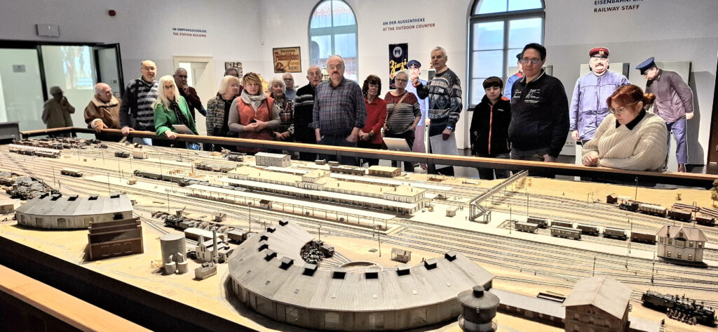 Zuerst wurde die Dauerausstellung im Industriedenkmal Bahnhof Bebra besucht. Herr Kehm nahm uns bei der Führung durch die Ausstellungsräume mit auf eine Zeitreise durch die 175-jährige spannende Geschichte des Bahnhofs. Die Ausstellung stellt den Menschen in den Mittelpunkt, die am Bahnhof Bebra arbeiten oder ihn als Reisende passieren. Herr Kehm zeigte an anschaulichen Exponaten u.a. die harte Arbeit und das Selbstverständnis von Eisenbahnern von damals und heute. Zwei Modelleisenbahnanlagen zeigen den Bahnhof Bebra um 1907 und um 1975. Ein als Warteraum inszenierter Ausstellungssaal vermittelt die Geschichte des Bahnhofs vom Nationalsozialismus bis zur Deutschen Teilung. Beim Originalexponat des Modells einer Dampflokomotive der Baureihe 38 im Maßstab 1:10 kamen wir aus dem Staunen nicht mehr heraus. In einem weiteren Raum konnten wir in einem Modell die Gleisanlagen mit fahrenden Zügen in den Grenzbahnhöfen Gerstungen und Bebra nachvollziehen. Herr Kehm erläuterte dabei die Sperranlagen sowie die umfangreichen Grenzkontrollen an der damaligen innerdeutschen Grenze. Im Weiteren ging er auf die Bedeutung des heutigen Bahnhofs ein. Viele werden nach diesem interessanten Kennenlernen der Dauerausstellung diese erneut besuchen, um die Inhalte mit den dort vorhandenen Videos/Zeitzeugenberichte zu vertiefen.